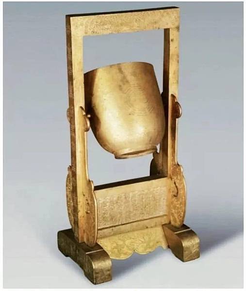 孔子曾在魯桓公的廟堂中見到欹器,它放在座位的右邊,後世座右銘即來源於此。圖為清光緒年間造銅鎏金欹器,欹器“虛則欹,中則正,滿則覆”,孔子由此感嘆為人處世“滿招損,謙受益”。