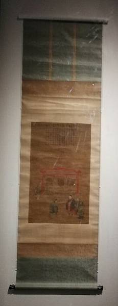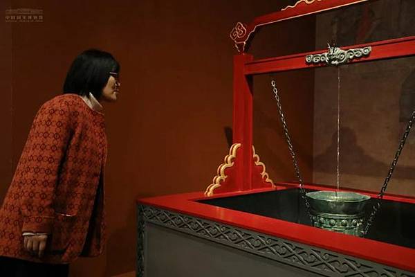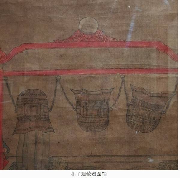 此外,在展覽中一幅明代的《孔子觀欹器圖軸》中,我們看到了三個並排懸掛在橫樑上的欹器,它們正好展示了上述欹器的三種狀態。