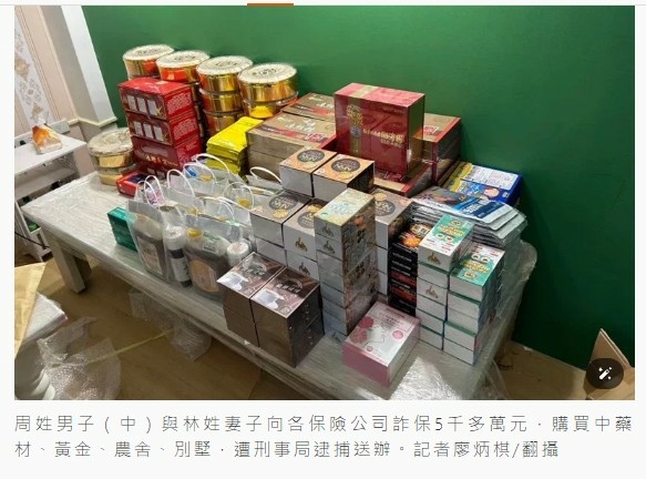 刑事局偵七大隊接獲保險公司報案,報請台北地檢署檢察官黃珮瑜指揮偵辦,查出這對夫妻以各種理由自述意外,主要是「輕微碰撞」,並假藉購買自費藥品,實際去購買高單價「燕窩」、「大鴕精」等中藥材,再取得不實診斷證明及收據,向多家保險公司申請理賠金。甚至變賣上述藥品牟利。