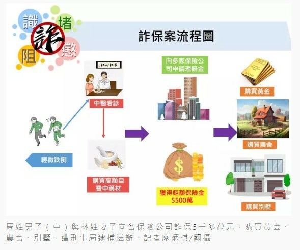 靠詐保成為「千萬富翁」?新北一名周姓男子,從2014年開始,為自己和妻女,先後購買了61張意外險保單,一家人以「搭捷運跌倒」、「走路被人撞到」等等理由,到中醫診所看診,自費購買高價藥材,密集向多家保險公司申請理賠,10年間沒有工作,詐保高達5千5百萬元,還把錢拿去買價值兩千六百萬的金條,跟在花蓮買兩棟別墅,但最終還是被警方以及保險公司識破。假跌倒詐保10年 「退休夫妻靠演技」海削保險公司5千5百萬│TVBS新聞網 https://bit.ly/3xsDzNH