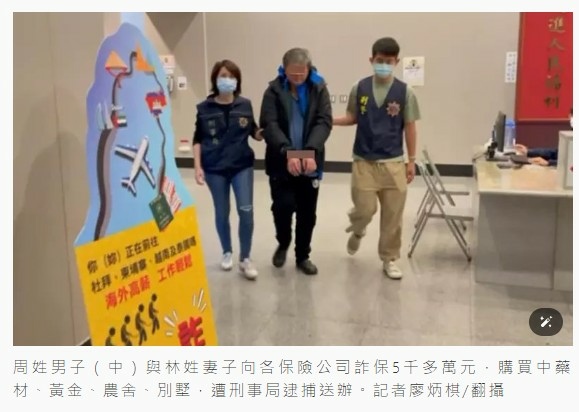 53歲周姓男子與56歲林姓妻子自2014年起,密集替自己與未成年女兒投保5家保險公司的「意外險」或「意外傷害險」,自2015年起開始「跌倒」,大量申請意外傷害理賠金,陸續獲理賠金額高達新台幣5504萬元,保險公司察覺異常後向刑事局報案。警方循線逮捕周與林到案,依詐欺及洗錢罪嫌送辦。