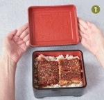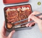 吃重盒,如鰻魚重、親子重、天重,有一個重要的規矩是不東戳一口,西戳一口。一律從重盒的左下角開始吃逐漸往右(圖❷)。禮必有理,讀者有沒有注意到這和西餐禮儀切牛排要從左下角開始切一樣呢?