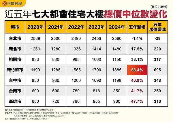 房仲業者統計七大都會區2020年至2024年間,各年度住宅大樓總價中位數變化,在2020年之際,尚有桃園市、台中市、台南市與高雄市四大都會區總價中位數落在1000萬元內,但到了2024年,總價中位數還在1000萬元內則僅存台南市與高雄市,房價明顯上漲,而新竹縣市住宅大樓5年間總價中位數漲幅達58.4%,七都中最強勁。