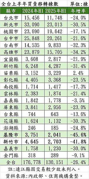 根據內政部數據顯示,全台縣市上半年買賣移轉棟數都呈現衰退,各縣市跌幅約10%~40%左右。其中,基隆市上半年買賣移轉棟數達2041棟,衰退幅度高達45.6%。