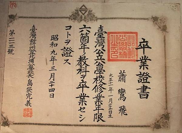 日昭和9年蕭鸞飛北埔公學校卒業證書-客家雲 Hakka Cloud https://bit.ly/3xFAGJB