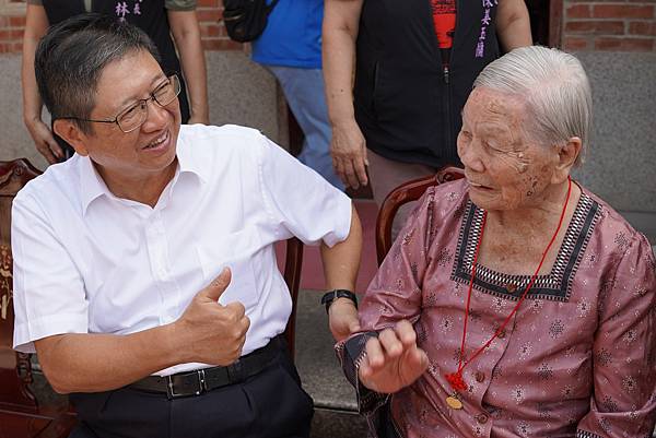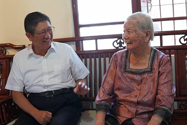 縣長楊文科緊接著前往拜訪100歲朱華康,他育有2男5女,重聽、視力不好,但身體健朗,平常拄拐杖行走,會自己走到附近公園聊天,他說,長壽之道就是要保持心情開朗、樂觀。另103歲羅劉緞妹,育有2男2女,需拿拐杖及輪椅輔助,以前務農、採茶、燒木柴,胃口不錯。