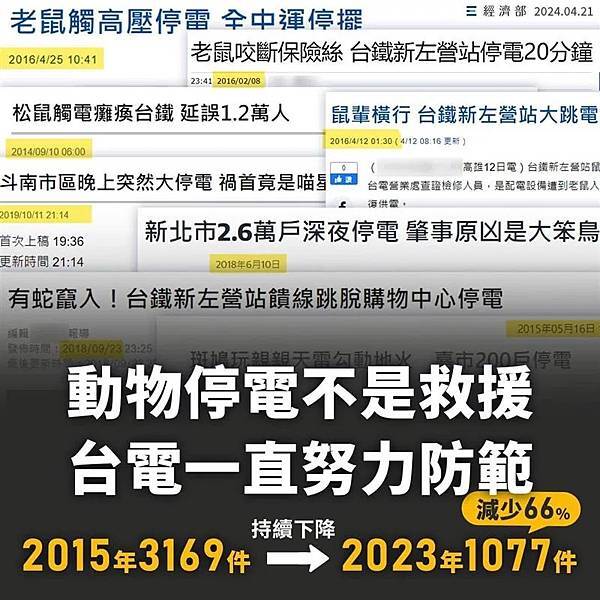 經濟部臉書小編發文指出,事實上,動物誤觸造成的停電一直都有,不是現在才有。全國超過43萬公里的電力線路、300多萬根電線桿,台電也持續努力防範,動物停電已從2015年的3千多件,降到去年的1千多件,減少超過6成。