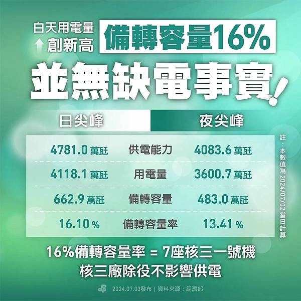 他表示,現在不是剩的不夠多,而是一直停電、沒電可用,對民眾來說,不斷停電、跳電就是缺電。民進黨最愛引用數據是減少的次數,但停電最重要的關鍵指標是戶數與時間,「政府數據總是與人民感受差距極大」。