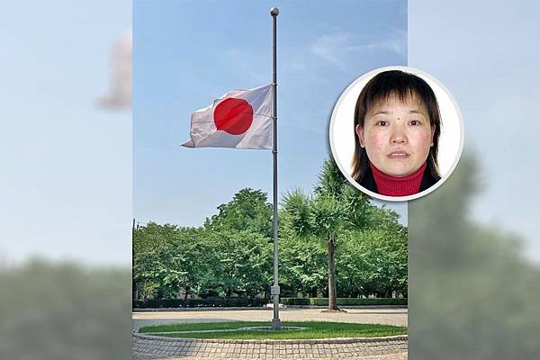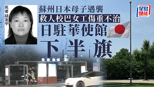 蘇州女巿民胡友平為阻止兇徒殘殺日本小學生而喪生,日前日本大使館為其下了半旗。 (圖片來源:網頁截圖)