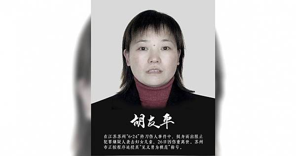 (中央社台北28日電)一對日本母子24日在江蘇省蘇州市被一名中國男子持刀刺傷,事件中一名挺身而出阻止犯罪嫌疑人施襲的中國市民胡友平,26日傷重離世。蘇州市表示會追授她「見義勇為模範」的稱號。
