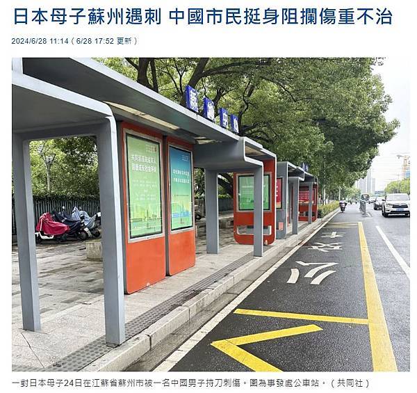 澎湃新聞今天報導,24日下午4時許,蘇州市高新區塔園路新地中心公車站發生一起持刀傷人案件,造成3人受傷,其中1人為中國籍,2人為日本籍,犯罪嫌疑人被迅速制伏。中國籍傷者胡友平在阻止嫌疑人犯罪過程中受傷嚴重,經送醫搶救無效,於26日不幸離世。2名日籍人員中,1人在院治療,無生命危險;另1人當日已出院。