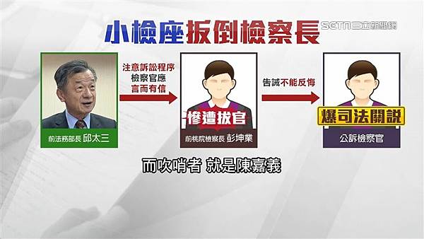 2019年勵新醫院院長張煥禎因為逃漏稅5億,和公訴檢察官請求認罪協商,不過檢察官事後反悔,前法務部長邱太三就親自出面,要前桃院檢察長彭坤業「注意訴訟程序」;沒想到幾天後,承辦檢察官就接獲指示要求不能反悔,這才爆出關說醜聞,最終導致彭坤業拔官,而吹哨者就是陳嘉義。