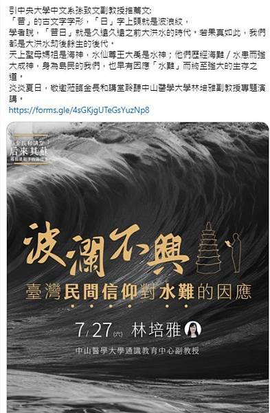 一、講題:波瀾不興—臺灣民間信仰對水難的因應