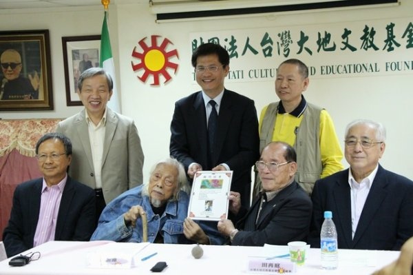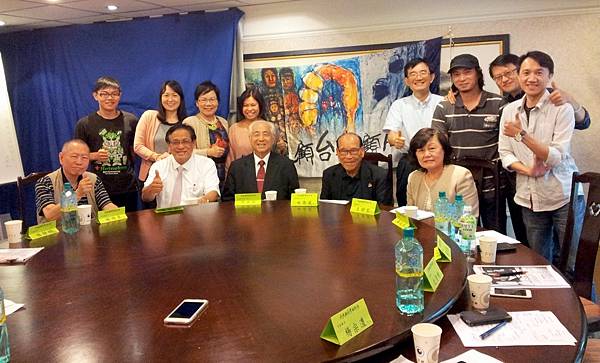 杜正勝院士甫加入大地董事行列,新任董事群帶來一場特別的董事會,說明自己的專業與對未來的期待。前排坐者左起為杜正勝院士、史明歐吉桑、田再庭董事長、許世楷駐日大使,後排立者左起為張炎憲館長、林佳龍市長(任大地顧問)、楊緒東醫師(攝於2014/4/19,詳見該次紀錄)。