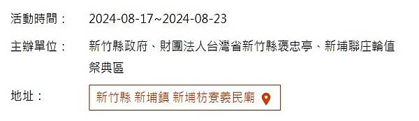 活動時間:2024-08-17~2024-08-23主辦單位:新竹縣政府、財團法人台灣省新竹縣褒忠亭、新埔聯庄輪值祭典區地址: