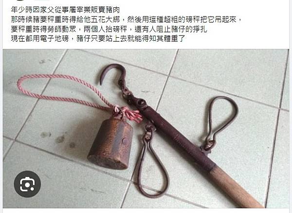 以前家戶都有秤仔,比較大叫量仔,再來是磅仔(最小的叫釘仔)。秤豬用的量仔