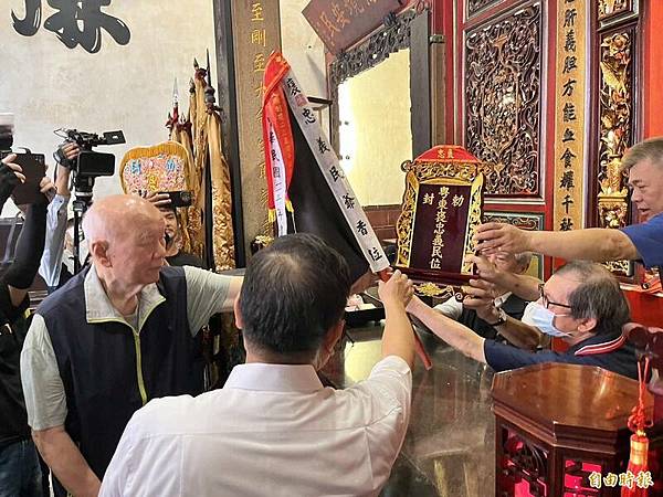 恭迎義民爺儀式進行祈福請神,黑令旗過爐,義民爺神位牌傳遞 。(記者廖雪茹攝)