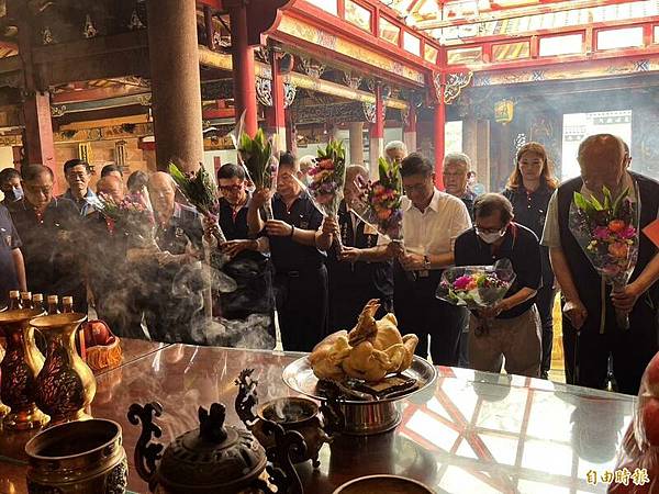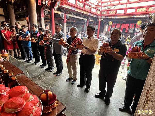 行政院長卓榮泰(右五起三人)、石光輪值祭典區總爐主范光周和新竹縣長楊文科等今出席新埔褒忠亭義民祭典。(記者廖雪茹攝)