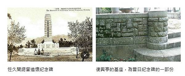 昭和 5 年(1930)11月位於角板山公園內的「佐久間總督追懷紀念碑」落成,紀念碑碑體於國民政府時期拆除,並在原址建「復興亭」一座,原來的臺基、矮牆、階梯與排水溝則被保留。