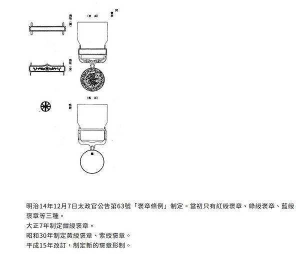 1881年12月7日-太政官布告第63號褒章條例制定。最初確立的只有紅綬褒章、綠綬褒章和藍綬褒章。