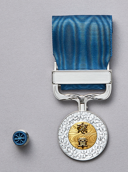 日本的勳章幾乎都是以七寶燒為主題進而來配色彩,而褒章除了綬帶顏色不同以外,其它全部一致,褒章的直徑為27mm的圓形,材質為銀,以樸素的櫻花紋為圖案,中央部分鑄有褒章二字,絛帶寬30mm。