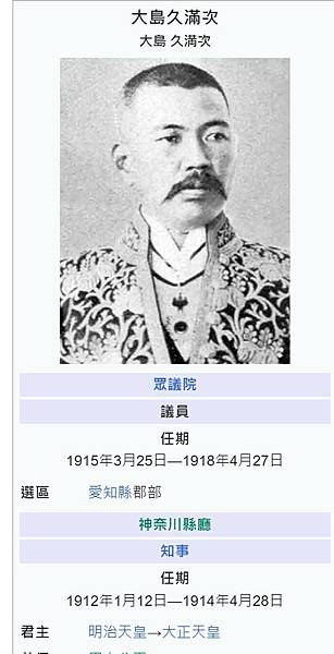 後被同屬立憲政友會的內務大臣原敬於明治四十五年(1912年)1月12日任命為神奈川縣知事,在知事任內因當時立憲同志會在橫濱市有很大的勢力,大島與神奈川縣議會發生激烈對立,大正三年(1914年)4月28日被立憲同志會支持的內務大臣大隈重信免職。四年(1915年)3月25日在第十二屆眾議院議員總選舉中於愛知縣 大島久滿次 - 維基百科,自由的百科全書
