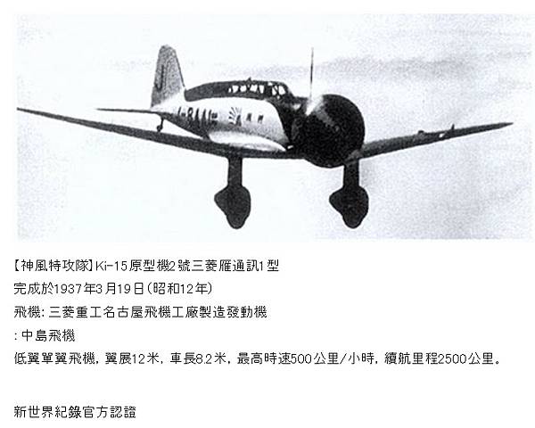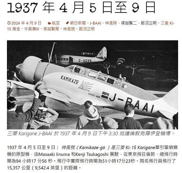 1937 年 4 月 5 日至 9 日: 神風號(Kamikaze-gō )是三菱 Ki-15 Karigane單引擎偵察機的原型機,由Masaaki Iinuma 和Kenji Tsukagoshi 駕駛,從東京飛往倫敦,總飛行時間為94 小時17 分56 秒。飛行中實際飛行時間為51小時17分23秒。兩名飛行員飛行了 15,357 公里(9,542.4 英里)的距離。