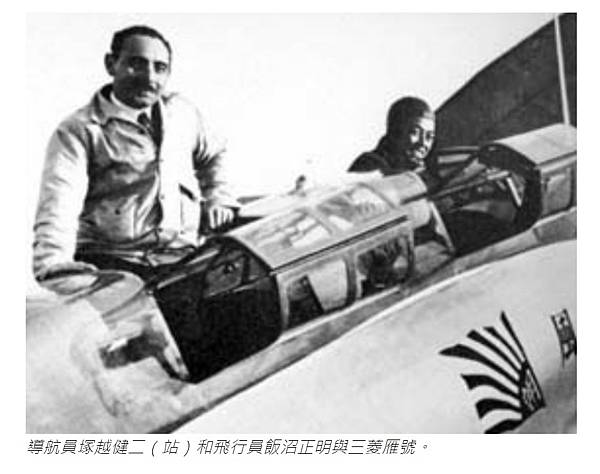 導航員塚越健二(站)和飛行員飯沼正明與三菱雁號。