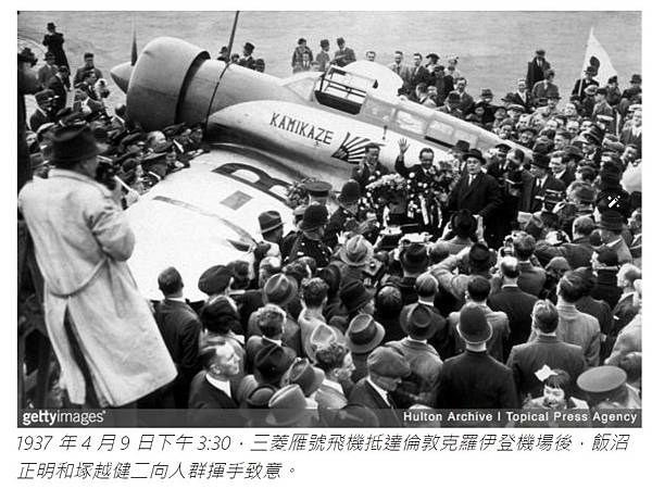 1937 年 4 月 9 日下午 3:30,三菱雁號飛機抵達倫敦克羅伊登機場後,飯沼正明和塚越健二向人群揮手致意。