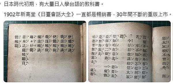 日本時代初期,有大量日人學台語的教科書。1902年新高堂《日臺會話大全》一直都是暢銷書,30年間不斷的重版上市。