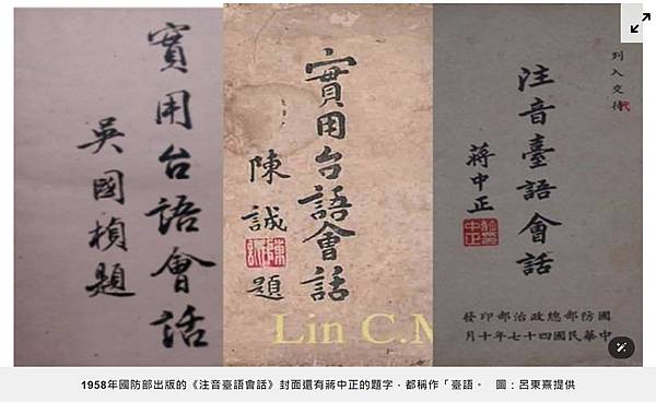 1958年國防部出版的《注音臺語會話》封面還有蔣中正的題字,都稱作「臺語。 圖:呂東熹提供