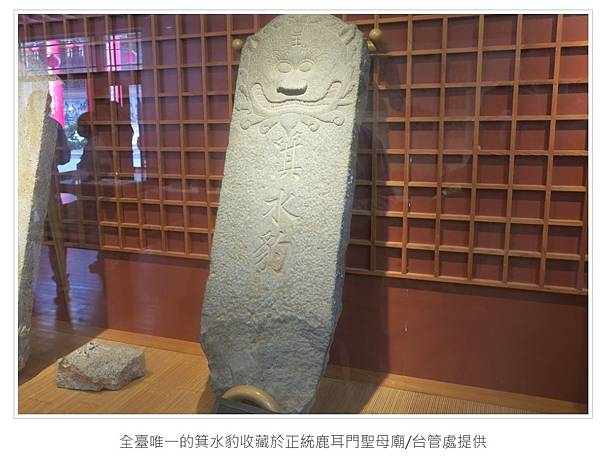鹿耳門於清道光初葉屢遭水患,鹿耳門聖母廟亦遭水浸。時人因立「箕水豹」石碑於神廟東北方十度之前方,藉以鎮水;並舉行祭溪儀式。聖母廟舊有記載曾記此事,廟祝、乩童亦口耳相傳。惜聖母古廟於清同治年間傾毀,此一「箕水豹」石碑亦湮沒。於聖母廟淇會於古廟遺址正進行挖掘整理,出土「箕水豹」石碑一方,其出土位置,與記載口傳相符,與「箕水豹」之所在方位亦合。此石碑為頂級青斗石,字體娟秀,獅頭(有謂係豹頭)造型與刻工皆極精緻。此石碑之出土,不僅為鹿耳門於清道光年間屢遭水患、聖母廟屢遭水浸史實得一證物:亦為古聖母廟遺址所在得一物證。且鎮水祭溪之「箕水豹」神碑極為罕見,此碑更屬宗教信仰之重要文物。