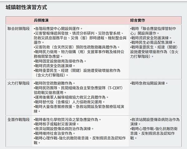 至於辦理城鎮韌性演習的目的,主要是為了落實動員準備的具體作為,驗證動員的效能,強化地方政府對戰爭發生時的應變制變能力,並發揮中央及各地方政府公務機關功能,確保戰時社會、民生運作無虞。
