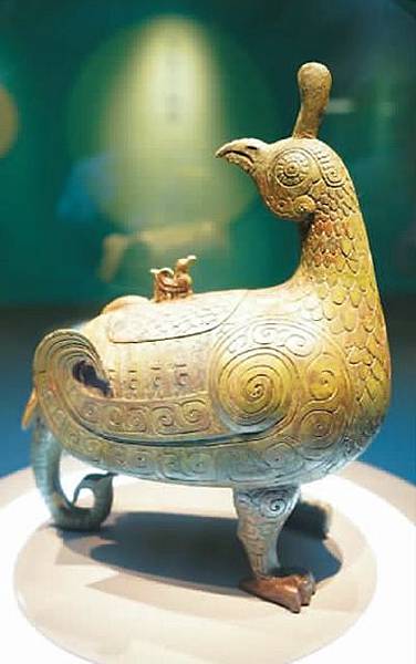 晉侯鳥尊距今三千年,古代歐亞大陸東西文明的交流剛啟動,中華文明正步入禮制時代。仔細端詳,它整體呈鳳鳥直立造型,鳥頭作回眸狀,尖喙上揚,高冠聳立,鳳眼圓睜,眼神投向遠方,上卷的兩翼間是飽滿的前胸,碩壯的雙腿,扇形的齊短尾微微翹起,雙爪緊緊扣地,身上飾羽紋和雲紋,一副卓然於世的神態。