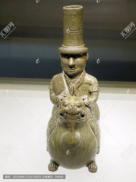 與首件越窯青瓷造型、意匠近乎一致的,有故宮博物院珍藏的一件「西晉青釉人騎獸器」。該器高17.7厘米,造型也是一深目高鼻、絡腮鬍子的胡人騎神獸。胡人高帽的做法與洗硯池晉墓出土者完全相同,只是衣服的紋樣略有不同。其胯下的神獸也作獅虎形,闊口獠牙,身上有鱗片,頭上似有角,為麒麟、天祿、辟邪一類的神獸。