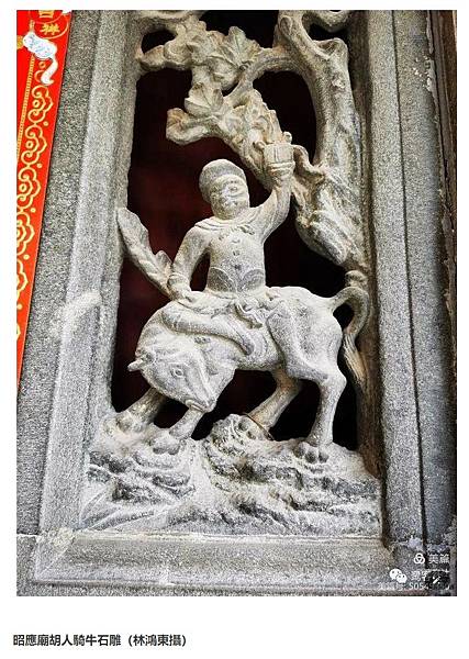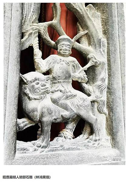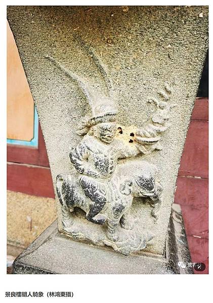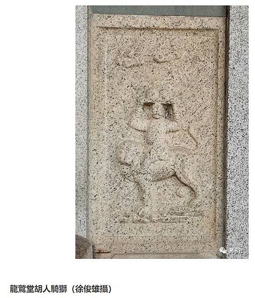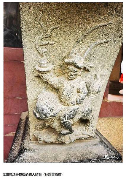 林鴻東老師在文中記載,明清時期,閩南一些宮廟、牌坊、民居建築裝飾中陸續出現了一些以胡人騎獅為主體的胡人石雕(洋人石雕),他曾經在閩南一帶尋訪這些胡人騎獅石雕,有的至今仍保存完好。林鴻東表示,這些以胡人騎獅為主體的胡人石雕可以說是閩南地區海絲文化的珍貴遺存。