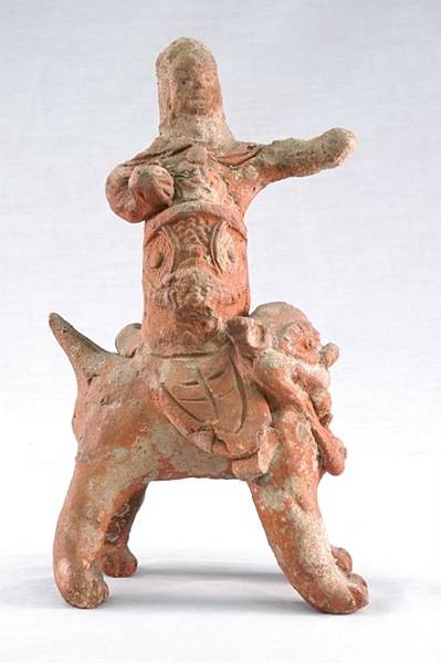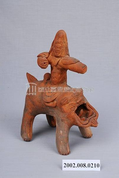 本件為陶燒風獅爺,武將騎獅作彎弓拉劍的驍勇姿勢,獅子張開大嘴吐舌露牙表情兇猛。一般立於屋頂,又稱「屋頂風獅爺」。風獅爺是民宅屋頂和村落常設的厭勝物,民間傳說是武功神力高強的人物,被人民安置於屋頂,發揮鎮風壓煞驅邪的厭勝功能。獅子開口位置對準風口,發出的風鳴聲,判斷風力的大小。材質有石雕、泥塑、水泥、陶燒等等。