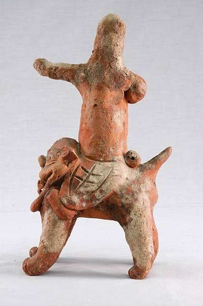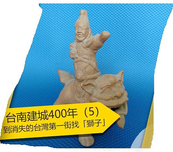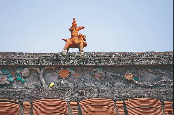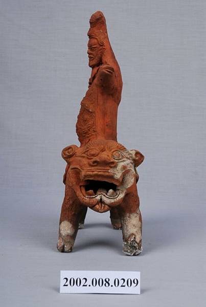 陶燒風獅爺,武將騎獅作彎弓拉劍的驍勇姿勢,獅子張開大嘴十分兇猛。風化嚴重,武將與獅僅存大致輪廓。武將身軀有裂痕,恐有裂成兩半疑慮。一般立於屋頂,又稱「屋頂風獅爺」 陶燒風獅爺 - 藏品資料 - 國立臺灣歷史博物館典藏網 https://bit.ly/3WMLijn