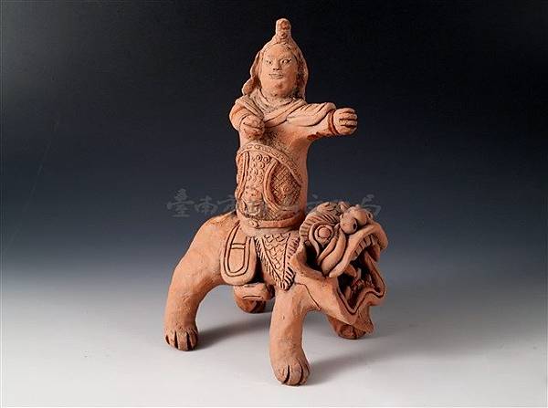風獅爺,不施釉直接素燒,呈現紅磚胎土溫煦樸實的質地;其造型做一武將跨騎著一隻像獅子的猛獸,武將瞠目抿嘴,神情剛猛威嚴,頭戴盔帽,帽頂和腹前戰甲也都裝飾著獅首,雙手做拉弓狀,腹側掛一箭袋,箭枝未細細刻劃,而是率意地以尖物戳出孔洞象徵,與頭部、戰甲等以模具翻製的精緻處,形成粗獷和細膩兼容的獨特美感