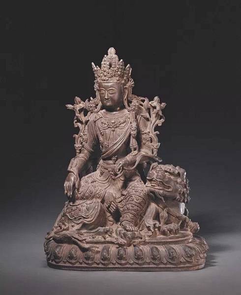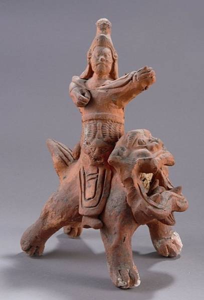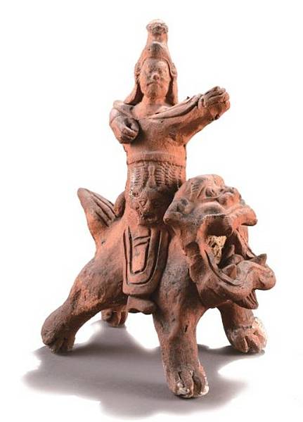 獅子則是兼具王權與神權光環的獸王。根據學者研究,獅子是古埃及王權的象徵,胡人騎獅造型早就出現在古埃及的護身符,體現為法老王站在獅背上。類似的造形也出現在兩河流域與印度,如兩河流域騎獅的娜娜女神與印度騎獅的杜爾迦女神。在佛教的初期階段,獅子是佛陀的象徵,故佛陀講法有「獅子吼」的比喻。佛教寺廟常見的文殊菩薩,其坐騎正是獅子。也就是說,胡人(常是神仙、帝王)騎獅的紋飾在北非、西亞、印度等地的古文明中,有其源頭。