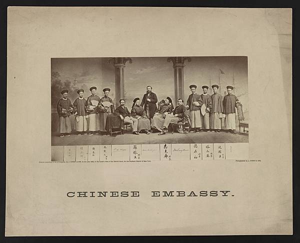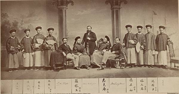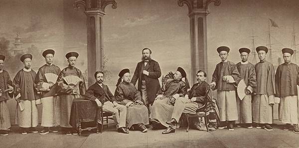 1868年,清政府派出的第一個由洋人率隊的正式外交使團——蒲安臣使團的合影,左起莊椿齡、桂榮、聯芳、鳳儀、德善、孫家谷、蒲安臣、志剛、柏卓安、德彝、塔克什納,元廷鏞、炕硯農