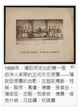 清朝政府派出的第一個正式外交使團,為1867年的蒲安臣使團。
