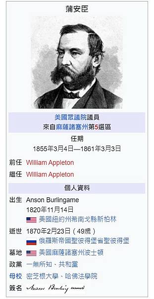 蒲安臣(Anson Burlingame,安森·伯靈格姆,1820年11月14日—1870年2月23日)是美國著名的律師、政治家和外交家,美國對華合作政策的代表人物。他是唯一一位既擔任過美國駐華公使,又擔任中國使節的美國人。