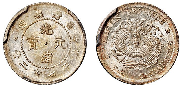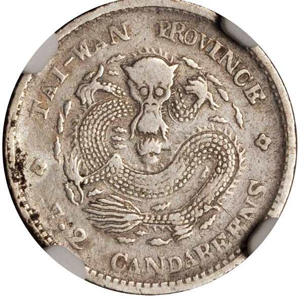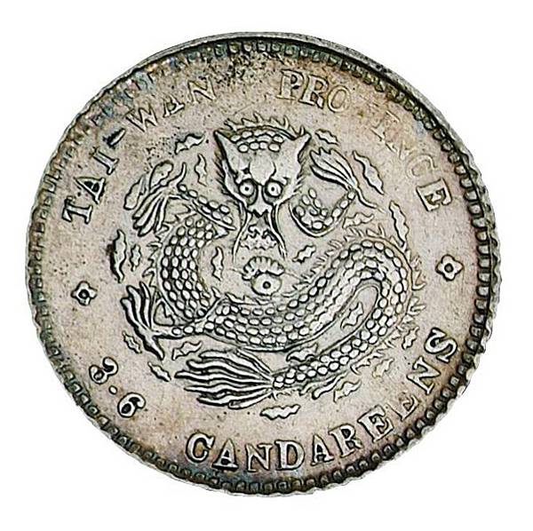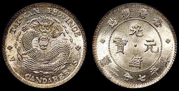 1893-1894年台灣製造光緒元寶庫平三分六厘銀幣一枚,台灣巡撫劉銘傳於1886年建成台灣機器局,後1893-1894年間開鑄台灣小銀幣,鑄行時間甚短,留存三分六厘小銀幣數量極稀,此枚銀幣的可貴之處在於鑄造精緻,龍圖及字跡均完整清晰,原色銀光,堪稱精品,徵集自海外著名收藏家,完全未使用品