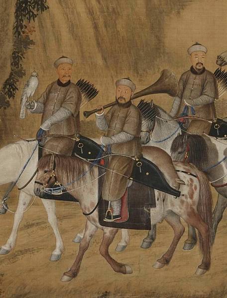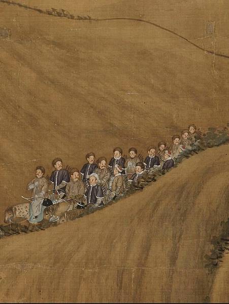 郎世寧《弘曆哨鹿圖》:郎世寧的這件作品描繪的是清朝宮廷狩獵的場景。哨鹿是清代宮廷一種狩獵活動,由人戴上鹿頭並摹仿鹿的嗚叫聲,以引誘鹿群,待鹿群聞聲而到時,獵者以弓箭火槍射殺。這件作品中弘曆皇帝乾隆帶著隨從騎著駿馬,盤山繞道緩步返回營地的情景。畫幅巨大,主要人物都具有肖像畫特徵,較真實地再現了當時哨鹿的場面。
