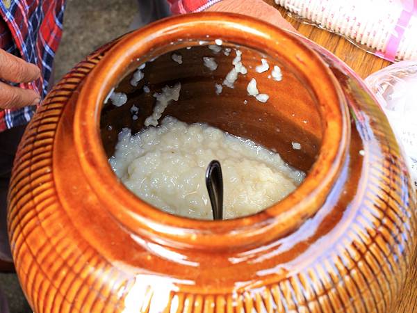 七罈酒就是用糯米釀製而成的。苓雅部落有十四位族人參加玉里鎮稻米產銷第十三班,他就以班產優良的糯米精釀成酒,打出苓雅部落豐年祭七罈酒的名號銷售;依產銷班的說法,這酒不但有文化,還很好喝。(圖片是七罈酒的酒釀)
