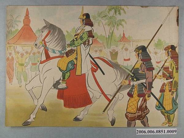 紙芝居《リゴール総督・山田長政》第10景,為以「山田長政」為主角的彩繪印刷紙芝居。正面描繪的是第10幕的場景,為穿著鎧甲的山田長政騎著馬凱旋歸來,周邊暹羅人民夾道歡迎的景臺灣紙芝居協會表紙紙芝居《リゴール総督・山田長政》第10景 - 藏品資料 - 國立臺灣歷史博物館典藏網 https://bit.ly/3yEdcFa