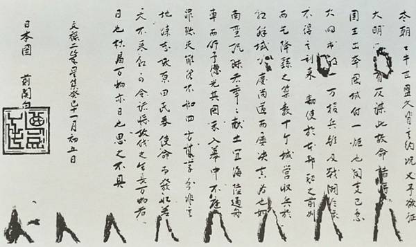 如南蠻琉球者,年年獻土宜,海陸通舟車,而仰我德光,其國未入幕中,不進庭,罪彌天。雖然不知四方來享,分為其地疏志,故原田氏(注:原田孫七郎),奉使命而發船,若是不來朝,可令諸將征伐之,生長萬物者日也,枯竭萬物者亦日也,思之,不具。