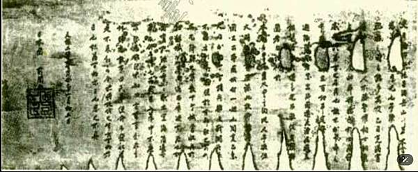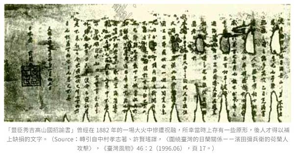「豐臣秀吉高山國招諭書」曾經在 1882 年的一場大火中慘遭祝融,所幸當時上存有一些原形,後人才得以補上缺損的文字。(Source:轉引自中村孝志著、許賢瑤譯,〈圍繞臺灣的日蘭關係--濱田彌兵衛的荷蘭人攻擊〉,《臺灣風物》46:2(1996.06),頁 17。)