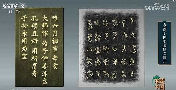 2020年8月,子仲姜盤的一張CT影像首次在央視媒體上公佈。上海博物館研究員週亞分析說,透過盤內壁的銘文來判斷,它是一件愛的信物。銘文分六行,共三十二字:隹六月初吉/辛亥大師作/為子中姜末/盤孔碩且好/用祈眉壽子子/孫孫永用為寶。是說六月初吉辛亥的這一天,晉國的一個大師(官職名稱)為他的妻子仲姜做了這件既大又好的盤,用來祈求長壽,希望後世子孫能夠永遠使用和珍藏。這篇銘文是學術價值極高的歷史資料。